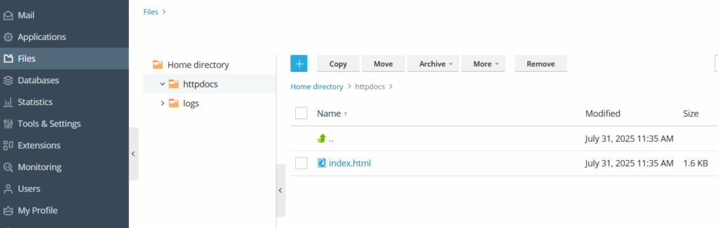 - In Plesk, go to Files from the left-hand menu.
